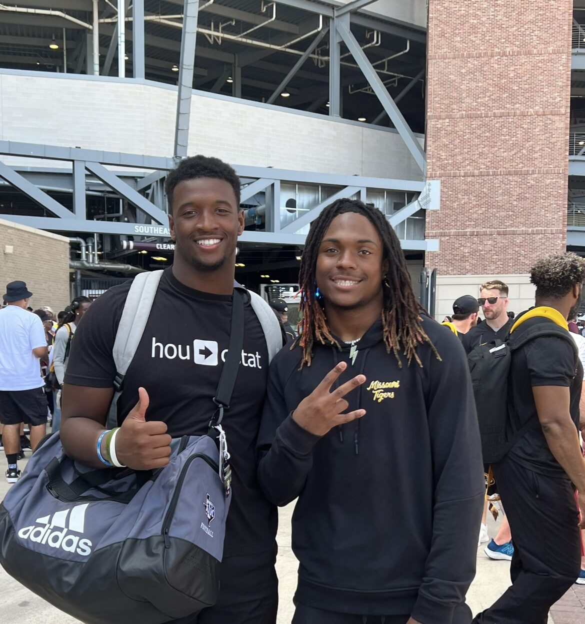 Texas A&M defeated Missouri 41-10 on Saturday but the postgame allowed former Dickinson teammates Donovan Green (Texas A&M) and Marquis Johnson to connect for this photo.