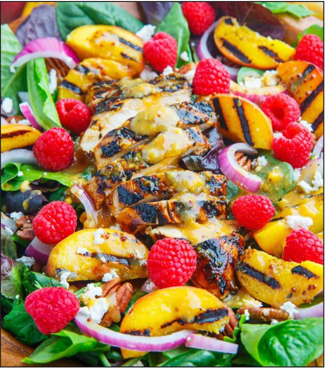 6 cups spring mix salad 2 chicken breasts (skinless & boneless) 2 large peaches (pitted & halved) 1/2 cup raspberries 1/2 cup walnuts (toasted) 1/4 cup goat cheese (cubed) Dressing 1 tbsp balsamic vinegar 1 tbsp minced onion 1/2 tsp each salt & pepper 1 tsp Dijon mustard 1 tsp maple syrup 5 tbsp olive oil In a bowl, whisk together all the dressing ingrdients. Brush 2-3 teaspoons of the dressing over the peaches and chicken. Marinate for 10 minutes. Grill the chicken breasts on medium-high heat on each side for 5–7 minutes, or until the chicken is no longer pink. Grill peaches flesh side down for 3–4 minutes to get grill marks. In a large bowl, toss salad with dressing and top with sliced chicken, peaches, raspberries, walnuts, and got cheese to serve.