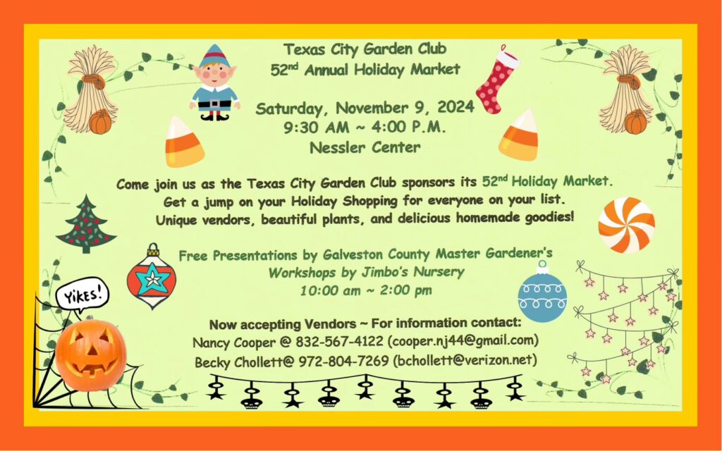 The Texas City Garden Club will host their 52nd Annual Holiday Market on Saturday, November 9, 2024, from 9:30 am to 4:00 pm at the Nessler Center in Texas City.