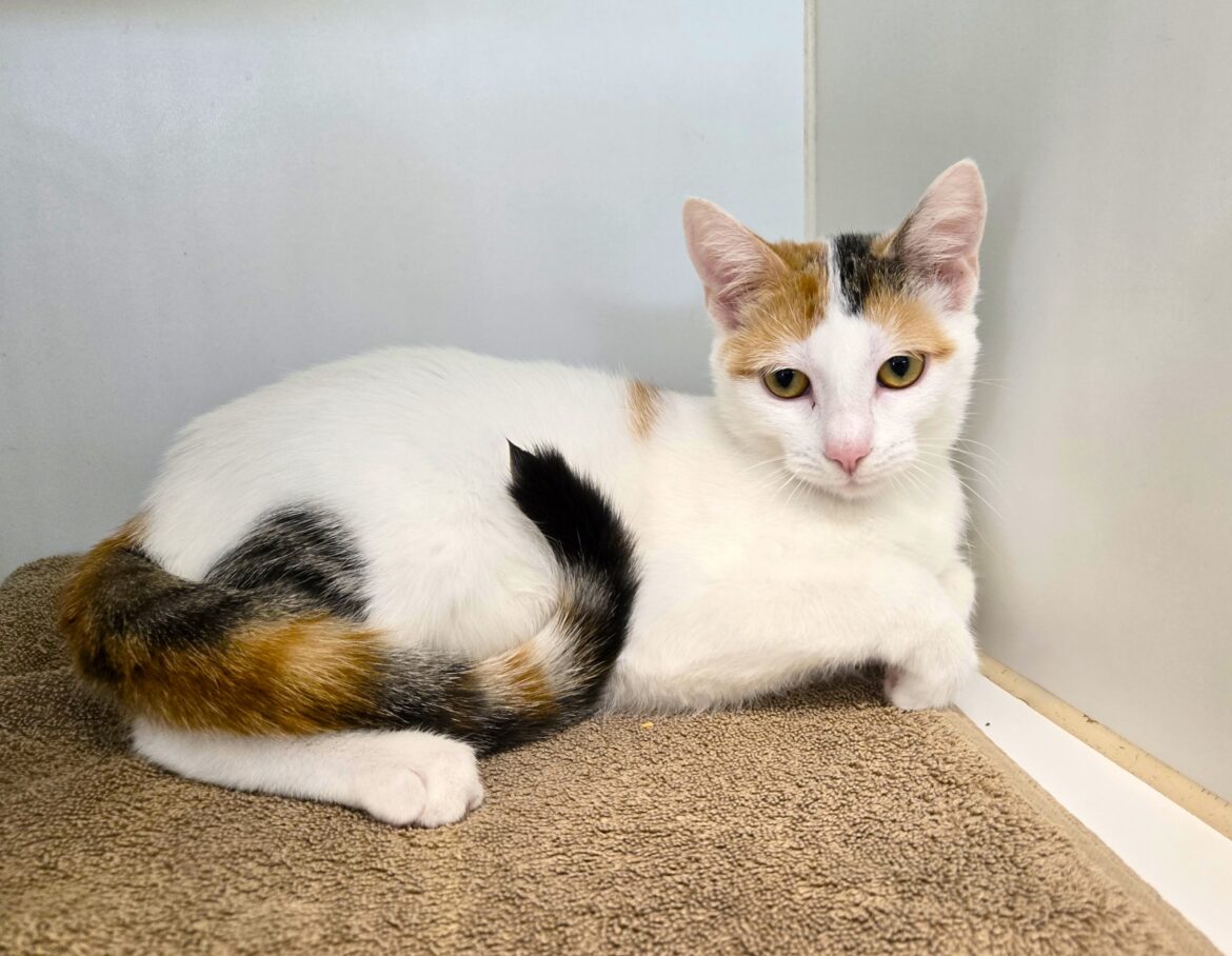 Give a big hello to Vanna Bright (A038042) who is a spayed Domestic Short Hair with a Van Calico coat. Vanna is about 7 months old and a real stunner. Her van pattern is mostly white with Calico markings on her head, tail and a few spots. Her delicate face, pretty eyes and pink nose are exquisite. Vanna is sweet, curious, playful and shy with new people. She prefers quiet, calm and some time to get acquainted. Vanna is worth every minute of it. If you are looking for a sweet, beautiful Princess to be your kitty, come check out Vanna Bright.