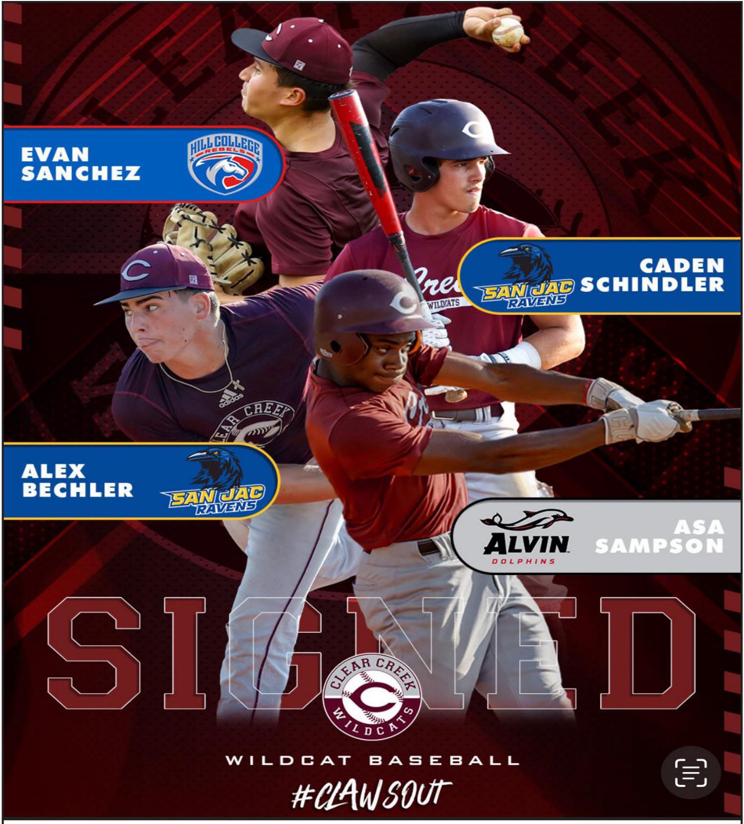 It has been a proud fall for the Clear Creek baseball team, which has had four players sign letters of commitment to play collegiately. Pitcher Alex Bechler signed with San Jacinto, while pitcher Evan Sanchez will attend Hill College. Outfielder Asa Sampson will play at Alvin College, and infielder-outfielder Caden Schindler will attend San Jacinto with Bechler.