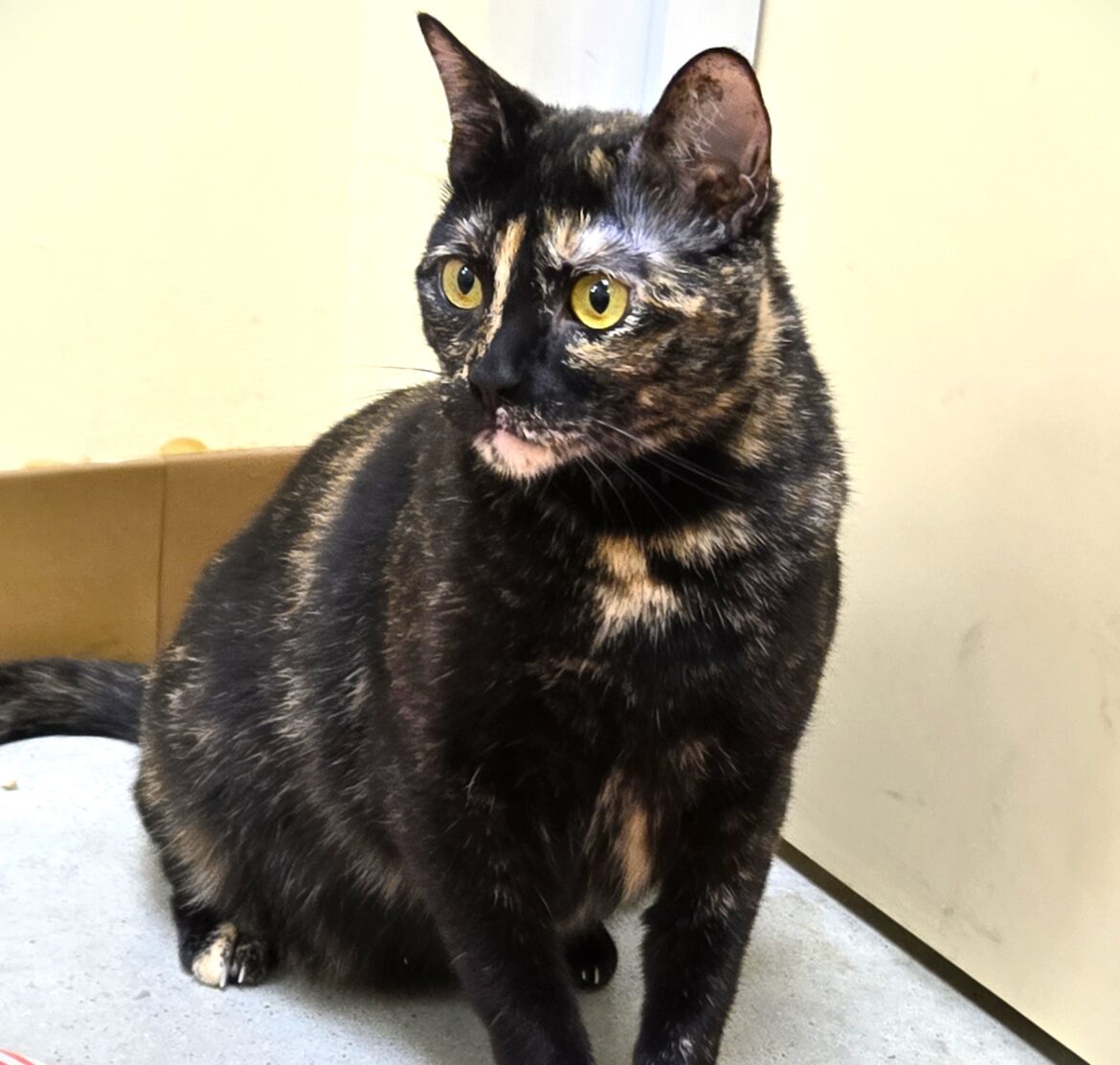 Give a big hello to Tutti Frutti (A037284), a spayed Domestic Short Hair with a tortoiseshell coat. Tutti Frutti is about 1 ½ years old, past the zoomies, but still a young playful kitty. She loves to get out of her cubes and climb the cat tree in the aisle or explore the get-acquainted room. If someone is available to work the wand toy with feathers all the better. Tutti loves the company of polite people but is not a fan of other cats. A few notes about Tutti: She is Combo Negative for FeLV and FIV. Her glorious coat is black splashed with orange, thick, smooth and glossy. Tutti even has a face blaze like a perfect tortie should. If you are looking for a beautiful, friendly kitty companion come on in and meet Tutti Frutti.