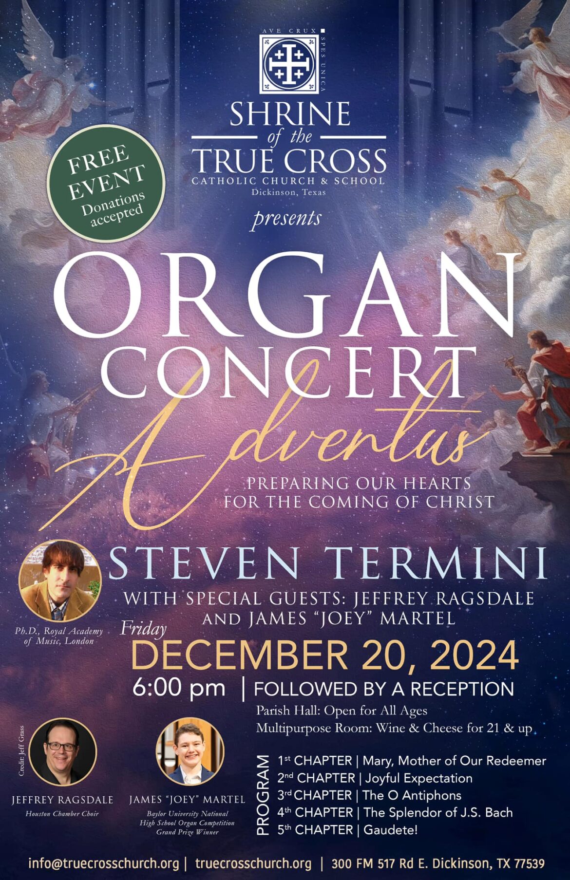 Organist Dr. Steven Termini PhD, along with Jeffrey Ragsdale of the Houston Chamber Choir and James Martel Baylor University National High School Organ Competition Grand Prize Winner will be performing during the concert which will be held this Saturday December 20 at 6 P.M.