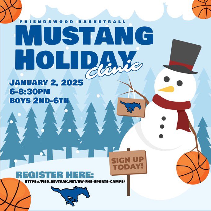 Friendswood will host a Holiday Hoops Clinic for grades 2-6 on Thursday, January 2, from 6 PM to 8:30 PM. Register at https://tinyurl.com/ye2yabs2.