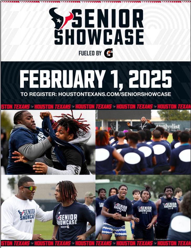 The Houston Texans will host their annual Senior Showcase on February 1, 2025, at their practice facility. The showcase will allow senior high school football players to work out in front of over 40 college football programs across FCS, Division II, Division III, and NAIA. The event is free, although players must be registered.