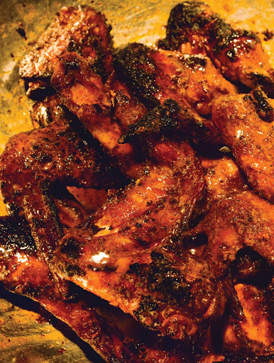 5. Spread out the wings on a sheet pan and wipe away any excess marinade. Sprinkle liberally with the dry rub, coating the wings all over.