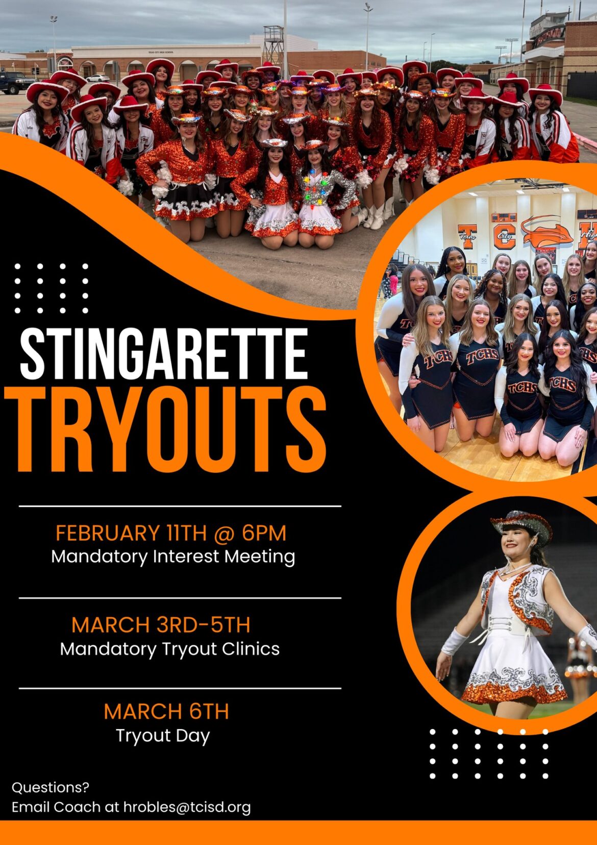 The door is open for Texas City High School Stingarette tryouts for the 2025-26 season. The interest meeting is at 6 PM on February 11, followed by the mandatory tryout clinics on March 3-5. Tryout Day is March 6. For more information, email at hrobles@tcisd.org.