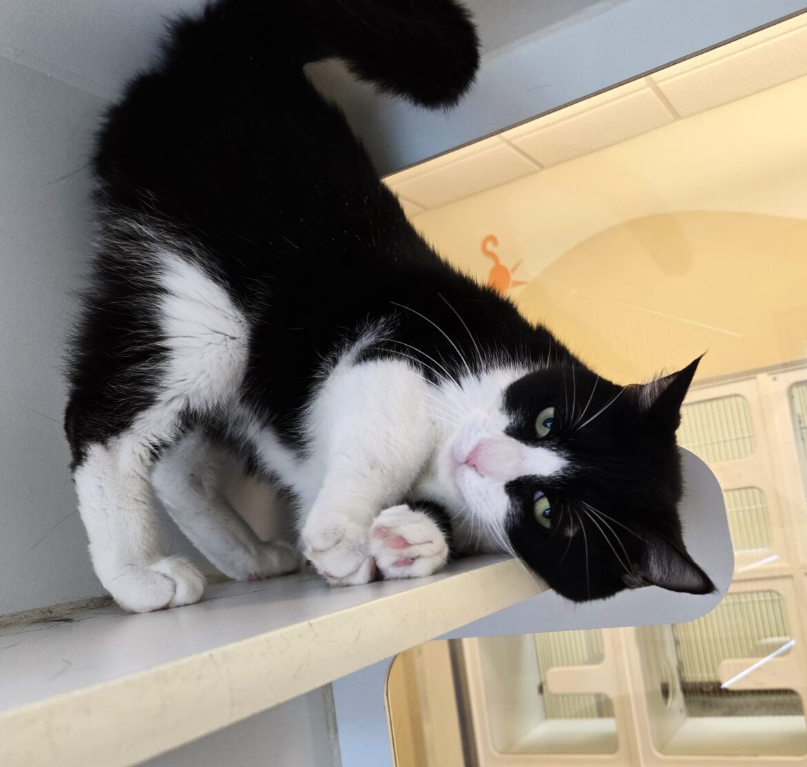 Give a big hell to Fen (A039923) who is a 6 year old, neutered Domestic Short Hair with a Tuxedo coat.  Fen is a good-looking cat with plushy black fur trimmed with sparkling white on his chest, tummy and legs.  A pink nose and subtle smile give him a sweet expression.  Fen is friendly, curious and craves attention.  Fen goes to the front of his cage and often collapses into a snugly pile when he sees a visitor.  Fen is waiting, watching and hoping for his new family to come take him home.