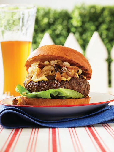 Hamburgers with Stilton Cheese, Caramelized Shallots and Mushrooms