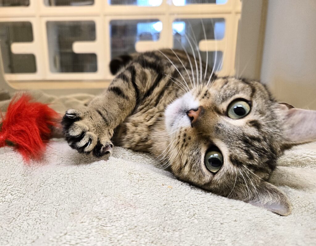 Give a big hello to Fudge Round (A040051) who is a 1 year old neutered Domestic Short Hair with a brown Classic tabby coat. Fudge’s deep chocolate swirls and twirls overlay a background of lighter shades of brown. He is a handsome cat and proud of the vivid tabby M on his forehead.  Expressive eyes and a sweet face soften his appearance. Fudge likes to pose, play with feather toys, flirt for attention and show off his silly side. He is ready and waiting for a family and home of his own. If you are looking for a kitty best friend, Fudge Round may be your perfect match.