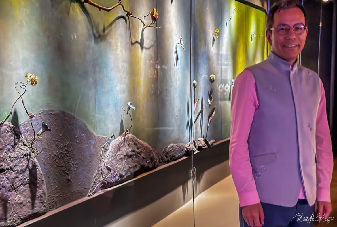 Birds, Dragonflies and butterflies, along with a view other species of flowers also outlined in titanium, dance along the exhibit, drawing the gazes of viewers.