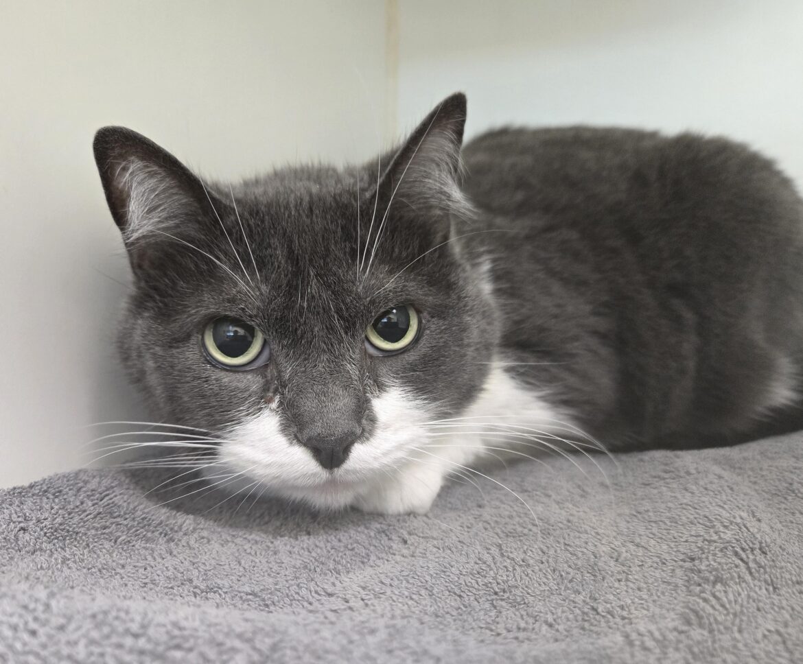 Give a big hello to Sable (A040271) who is a spayed eight-year-old Domestic Short Hair with a deep blue and white coat.  She has a lovely bi-color pattern and pretty green eyes.  Sable is mannerly, calm and a tiny bit shy until she knows you.  Even a grown-kitty likes to flop, roll, and make biscuits!  Come on in to meet sweet Sable – she may be your perfect kitty girl.