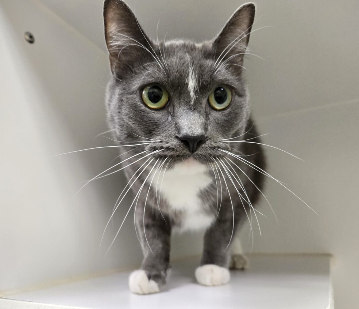 Give a big hello to Quentin (A040398) who is a neutered Domestic Short Hair with a deep blue and white tuxedo coat. He is about 2 years old, friendly and curious. Quentin is a handsome cat with his “formal” coat, light green eyes and impressive white muzzle and eyebrow whiskers. He has tried various gigs including auto mechanic and decided that isn’t for him. Quentin is hoping to be a lap cat and window lookout with a nice family and home of his own. Come meet Quentin soon!