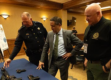 Pictured left to right: Smith County Chief Deputy Jimmy Jackson, Hegar and Sgt. Pete Peters view types of service weapons that were purchased with grant funds for the sheriff’s office.