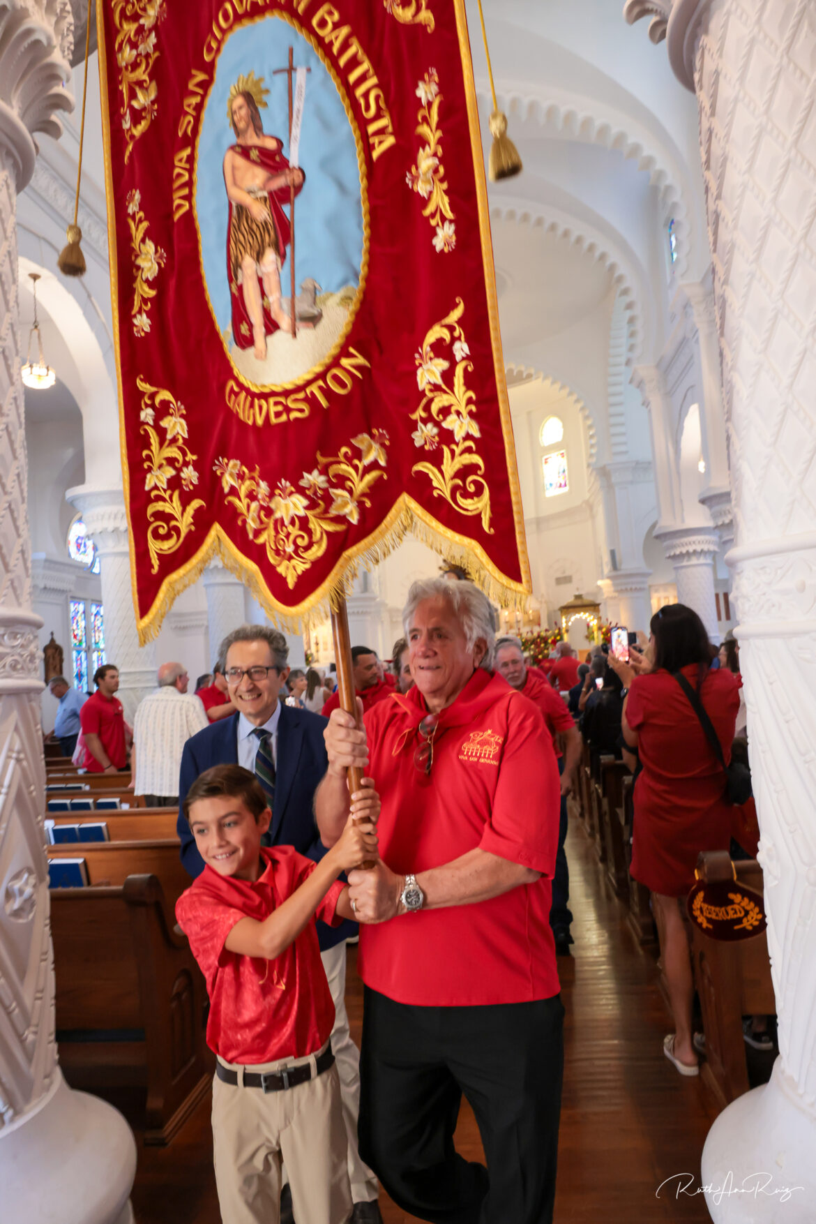 Tropea is working to maintain the authenticity of the celebration. The gold shrine was made in Galveston and is a near replica of the one in Sicily. The banner was specially ordered from outside of the United States and is made with gold and silver thread. The men’s shirts are very similar to the shirts worn by men in Italy during the festival.