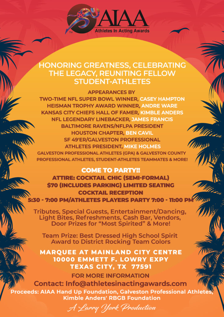 The event will be held at the beautiful Marquee in Mainland City Centre, located at 10000 Emmett F. Lowry Expressway, Texas City, TX 77591. Due to limited seating, event organizers recommend guests RSVP by July 13 th ’s food deadline. This inaugural event will feature an Athletes Player Party, entertainment, dancing, vendors, food, cash bar, raffles, door prizes, tributes, guest speakers, awards, Juneteenth references, and more!