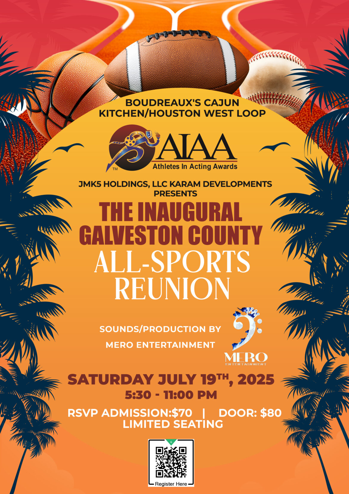 TEXAS CITY, TEXAS (June 30, 2025) – Galveston County, known for producing some of the highest numbers of professional athletes in Texas and across the country, continues to shine as a hub of sports excellence. On July 19th, Texas City will host the first annual County-wide All-Sports & Celebrity Reunion. Boudreaux’s Cajun Kitchen/Houston West Loop has been announced as the Title Sponsor. JMK5 Holdings, LLC, is the Presenting Sponsor.