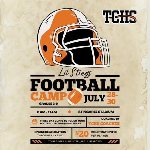The 2025 Little Stings Football Camp will be held at Stingaree Stadium from July 28 to July 30. Times will be from 8 AM to 11 AM, with doors opening at 7:30 AM. The camp will be for players from second grade to ninth grade. The cost is $20, which can be done online at https://tcisd.revtrak.net/TCISD-ATHLETICS/…. Registration can be done at http://bit.ly/46xfowC.