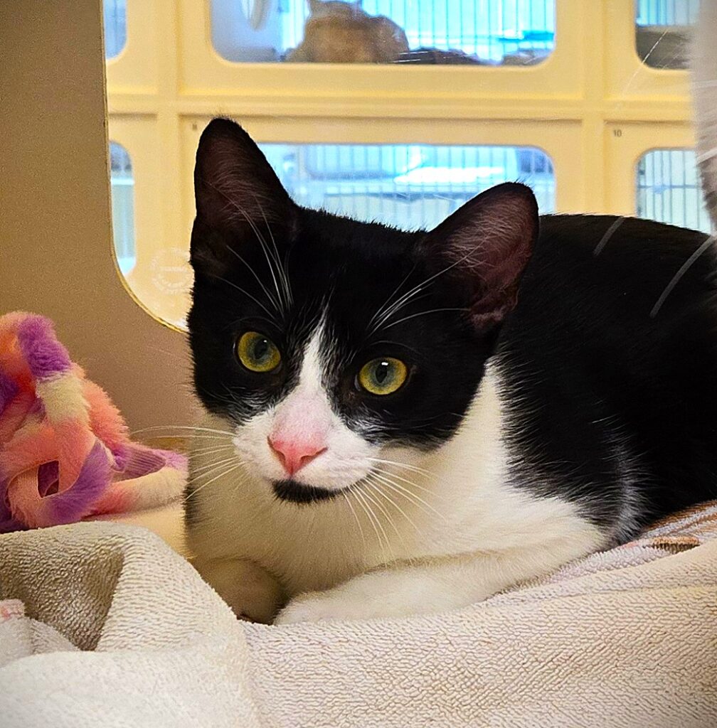 Give a big hello to Cheese (A040947) who is a 5 month old male Domestic Short Hair with a black and white coat. He is a playful, friendly “teenager” that thrives on attention and romping with his twin brother Ham (A040946). Toys and treats are welcome. Cheese’s bi-color markings are distinctive – white leggings in front, socks on his back paws and a cute black patch on his chin. His bright pink nose accents the peaked blaze on his winsome face. If you are looking for cuteness, fun and cuddles, come on in and ask to meet Cheese. He is waiting for his family and forever home.