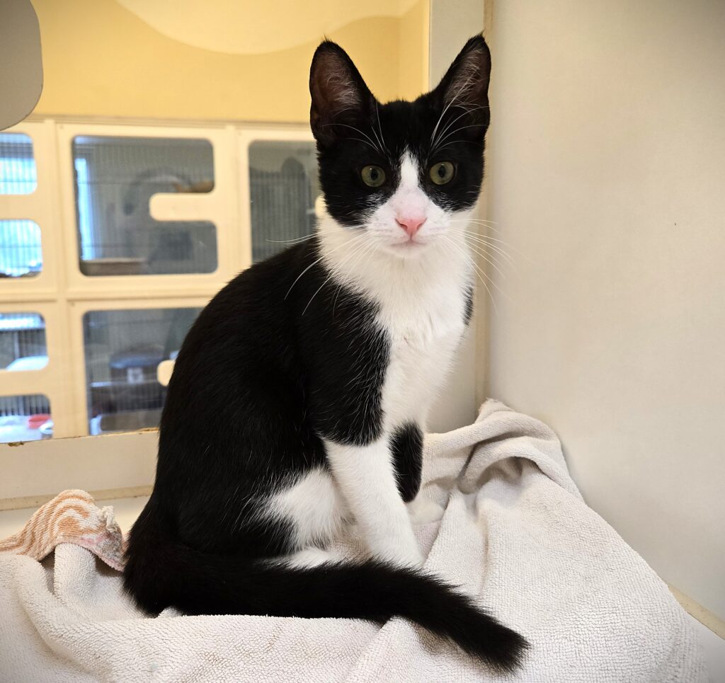 Give a big Howdy to Ham (A040946), who is a 5 month old male Domestic Short Hair with a black and white coat. He is a playful, friendly “teenager” that thrives on attention and enjoys a good romp playing with toys. Ham’s vivid bi-color markings are distinctive – white tummy, chest and leggings with black patches front and back. His bright pink nose accents the peaked blaze on his winsome face. If you are looking for fun and cuddles, come on in and ask to meet Ham. His bags are packed, and Ham is ready for his own family and forever home.