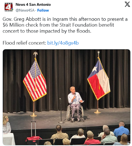 - Breitbart: Governor Abbott Delivers George Strait Checks to Texas Flood Victims Ignored by Fleeing House Democrats