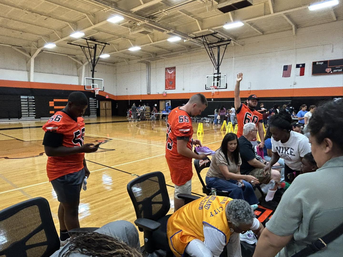 Members of the Texas City High School football team were among those who helped during the annual Valero Packback Giveaway. Over 500 students received a backpack filled with school supplies, while several students received a new pair of tennis shoes.
