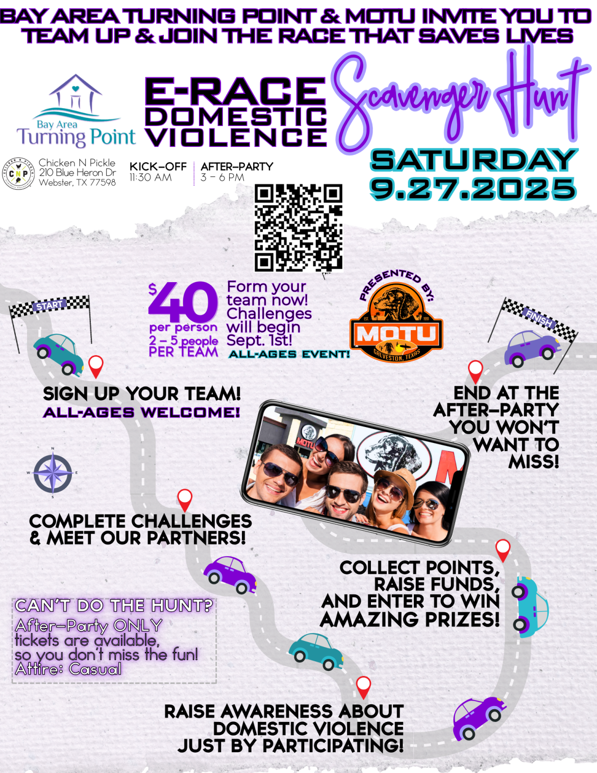 Webster, TX — September 27, 2025 — Bay Area Turning Point (BATP) is inviting the community to team up for a day of fun, adventure, and purpose at the inaugural E-Race Domestic Violence Scavenger Hunt, presented by MOTU. The event kicks off at Chicken N Pickle in Webster with check-in beginning at 11:30 AM, the hunt at 12:00 PM, and an after-party at 3:00 PM.