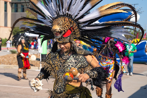 Photo: Danza Azteca Xiuhollin Huehuecoyotl perform traditional Aztec dances during Fiesta Comunidad 2024