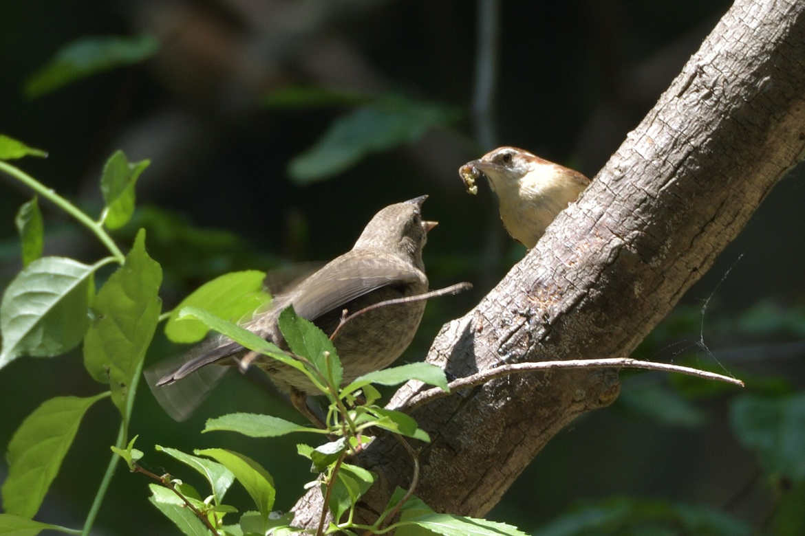 Photo Caption: A Carolina Wren feeding a juvenile Brown-headed Cowbird