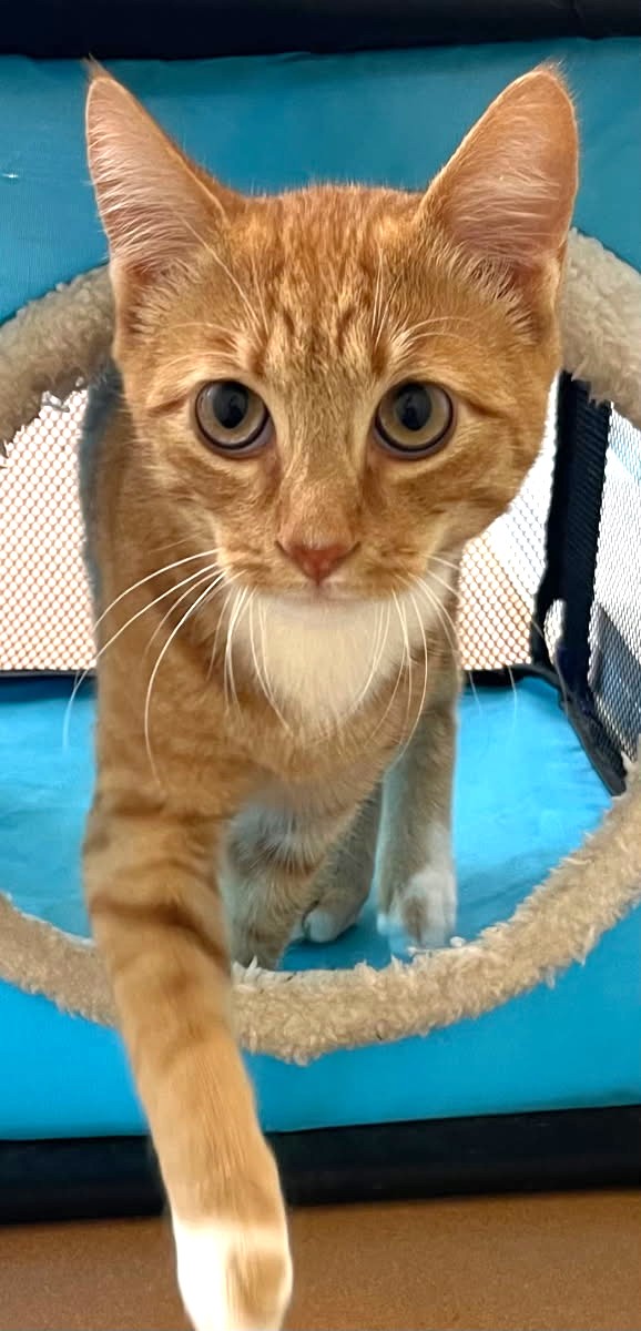 Give a big hello to Majestic (A041931), a 6 month old Domestic Short Hair with an orange tabby and white coat. Majestic is an outgoing, playful and energetic teenager. He likes company, attention, toys and romping. Orange tabbies are also called “ginger” or “marmalade” and range from buff to red. Majestic’s red coat is trimmed with white on his chin, chest, tummy and all four paws. Some of his toes feature red laces. Majestic’s wide intense eyes say “Look at me”! He has it all – great looks and personality. Come on in and ask to meet Majestic.