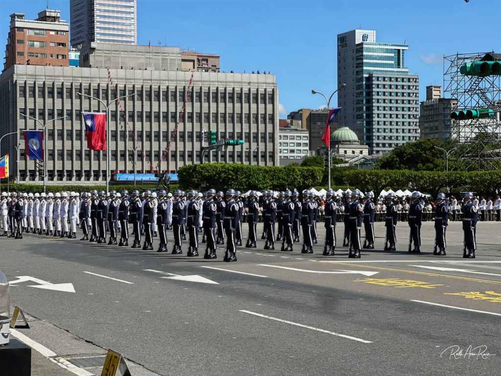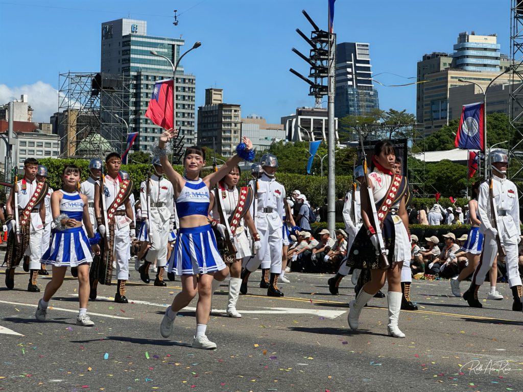 After his speech, confetti and streamers were strewn through the air, and the festivities continued with soldiers proceeding down the street, followed by a military band. The procession continued with children and adults waving the Taiwanese flag as they rode in military vehicles. There was a high school band with cheerleaders, along with other cultural performing groups who passed by.