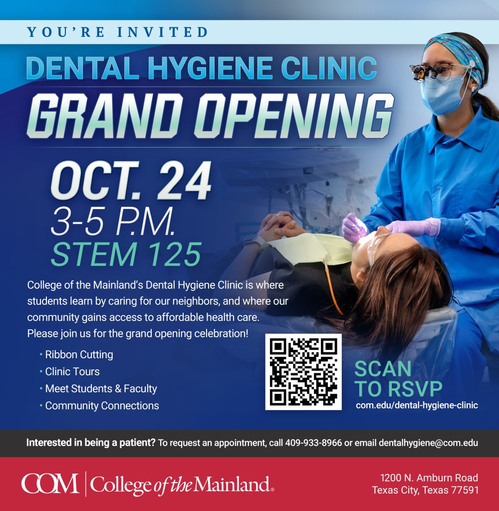 (Texas City, TX) — The College of the Mainland Dental Hygiene Clinic will soon open its doors to community patients. Over the past year, students have cared for friends and family as they refined their skills and gained hands-on experience. Now, they’re ready to serve the broader community. To celebrate, COM invites the public to a grand opening and ribbon-cutting ceremony on Friday, Oct. 24, from 3 to 5 p.m. in the Dental Hygiene Clinic, located in STEM 125.