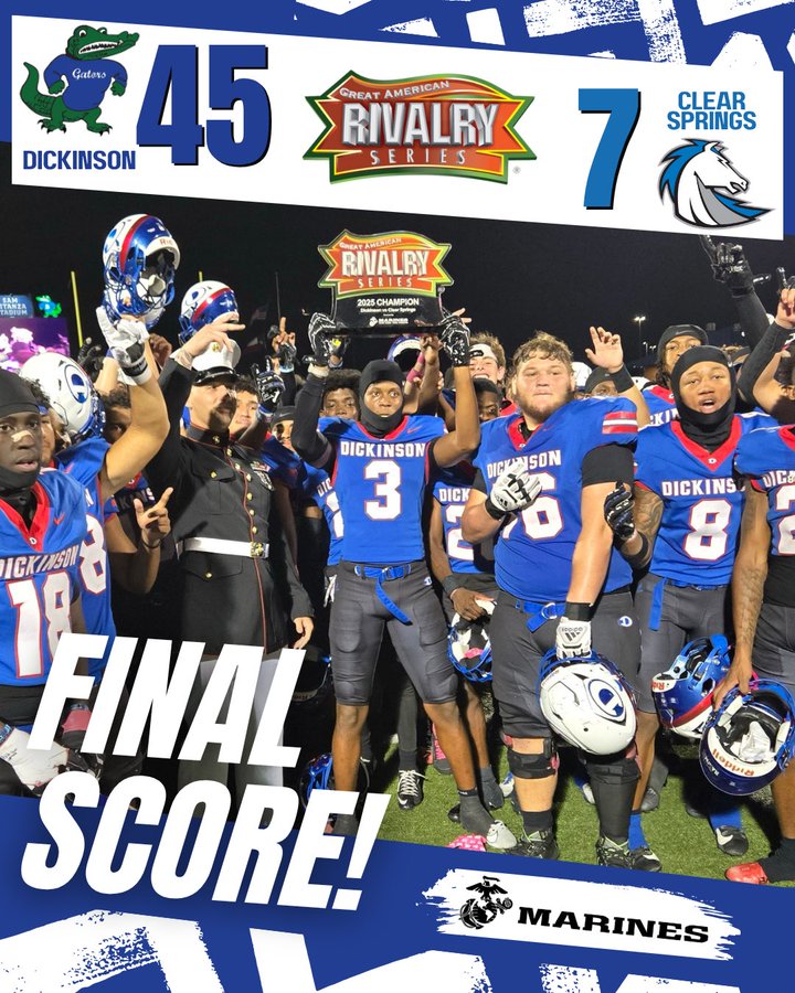 State-ranked Dickinson remained undefeated after topping rival Clear Springs 45-7 on Friday. The Gators host Clear Falls this Friday at 7 PM.
