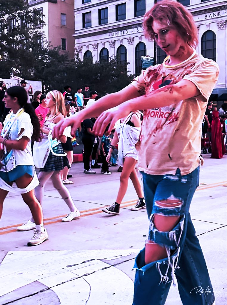The Ball High School Color Guard led the parade with their proud display of the U.S. and Texas flags. Then came the rambling ghostly characters. Some wore cheerful smiles and carried autumn-themed broomsticks while others looked eerier.