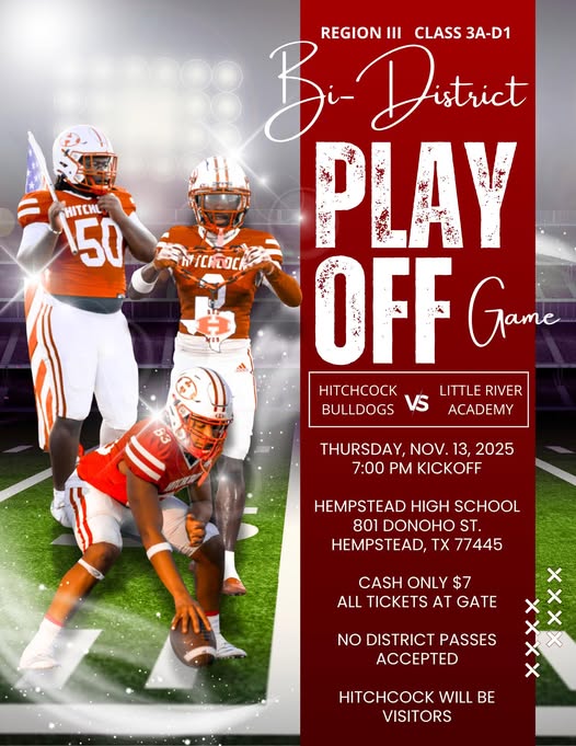 Hitchcock’s football team was off on Friday, the final week of the regular season, but the Bulldogs already know where they’ll be when the playoffs begin on Thursday. Hitchcock will face Little River Academy in a 3A Region III-1 bi-district round game in Hempstead at 7 PM. All tickets will be at the gate and will be $7.
