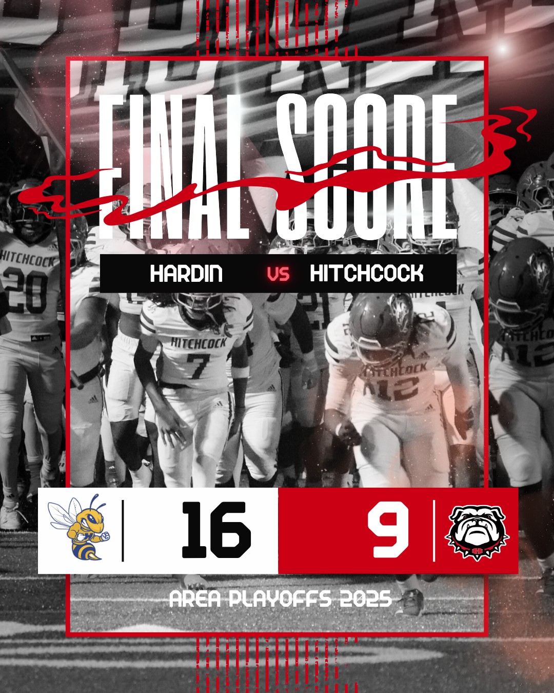 Hitchcock hung tough but fell short in a 16-9 loss to Hardin in a 3A Region III-1 area round game on Friday. The Bulldogs slowed down one of the state’s best offenses while staying in the game to the end. Hitchcock finishes the season with a 7-5 record.