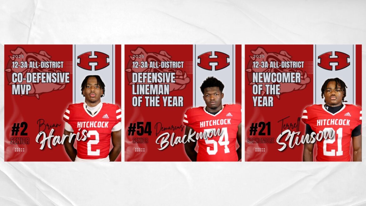 Twenty-three members of the Hitchcock football team received District 12-3A honors. Defensive back Brian Harris was named co-Defensive Player of the Year, while Demarkus Blackmon was selected as the district’s top defensive lineman, while Terrell Stinson was chosen as the 12-3A Newcomer of the Year.