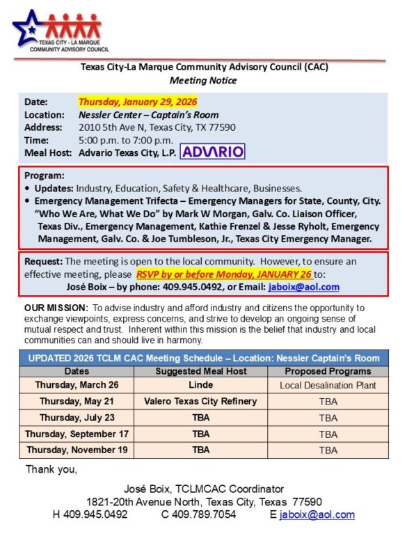 Texas City-La Marque Community Advisory Council (CAC) Meeting Notice: Thursday, January 29, 2026