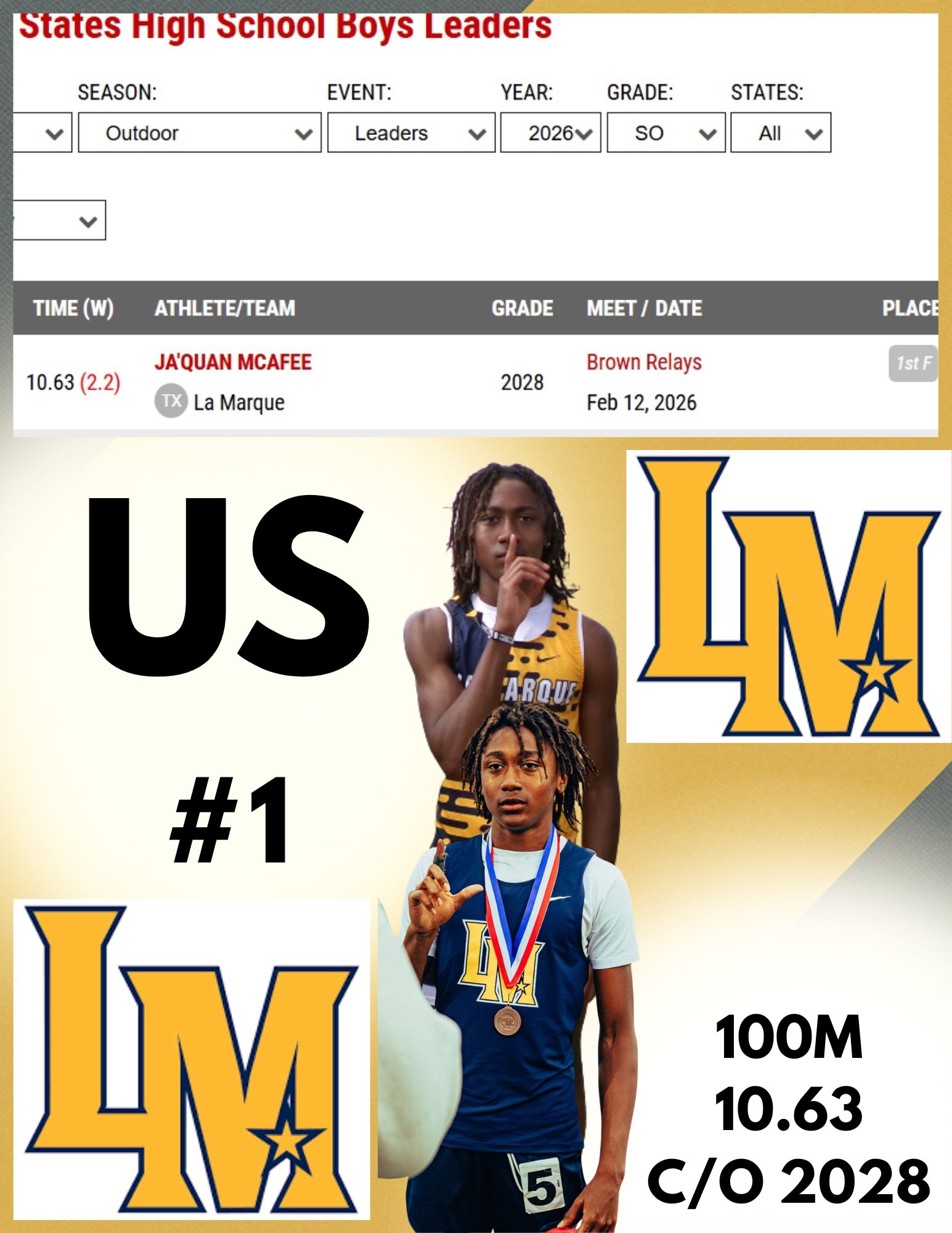 La Marque is home to the fastest sophomore in the nation, as Ja’Quan McAfee’s time of 10.63 in the 100-meter dash on February 12. McAfee is currently ranked third in the state of Texas in the event.
