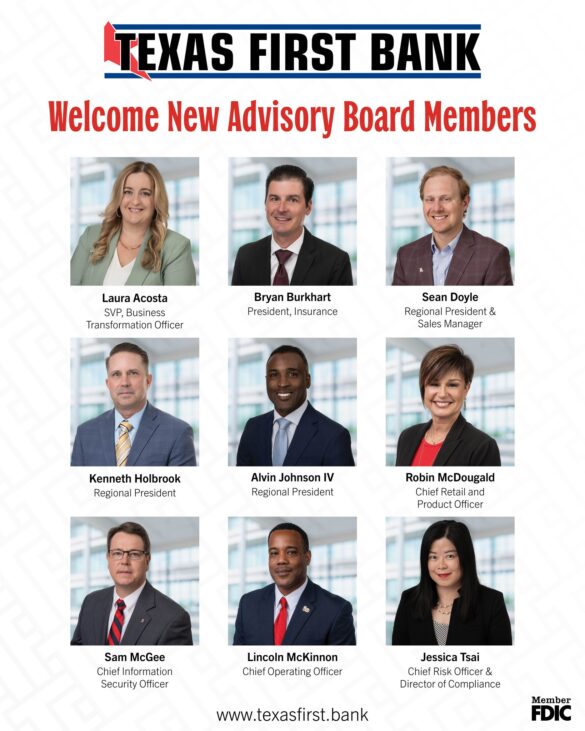 The expansion of the Advisory Board reflects Texas First Bank’s dedication to leveraging internal talent and institutional knowledge to guide the organization’s continued success. The newly appointed advisory directors are: