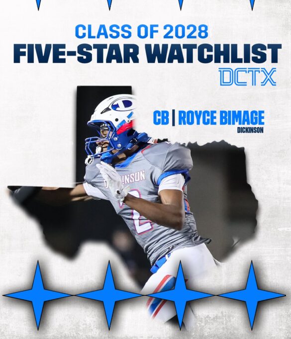 Dickinson cornerback Royce Bimage, who recently became a five-star prospect with Dave Campbell’s Texas Football, is in the hunt to become one of the highest-rated five-star prospects. Bimage will enter his junior season this fall and is already regarded as one of the nation’s premier pass defenders.