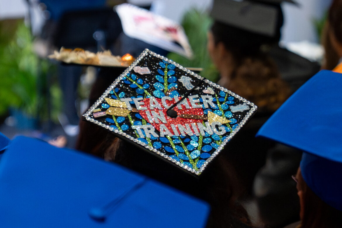 Photo: A COM Graduate’s decorated cap reads “Teacher in training”
