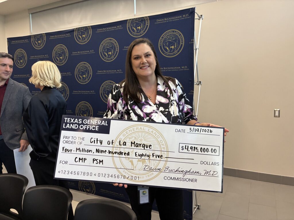 PHOTO: Colleen Chilcoat, Communications Coordinator for the City of La Marque, holds a ceremonial check representing a $4.985 million grant awarded by the Texas General Land Office on March 19, 2026, to support shoreline stabilization and marsh restoration at Mac McGaffey Highland Bayou Park.