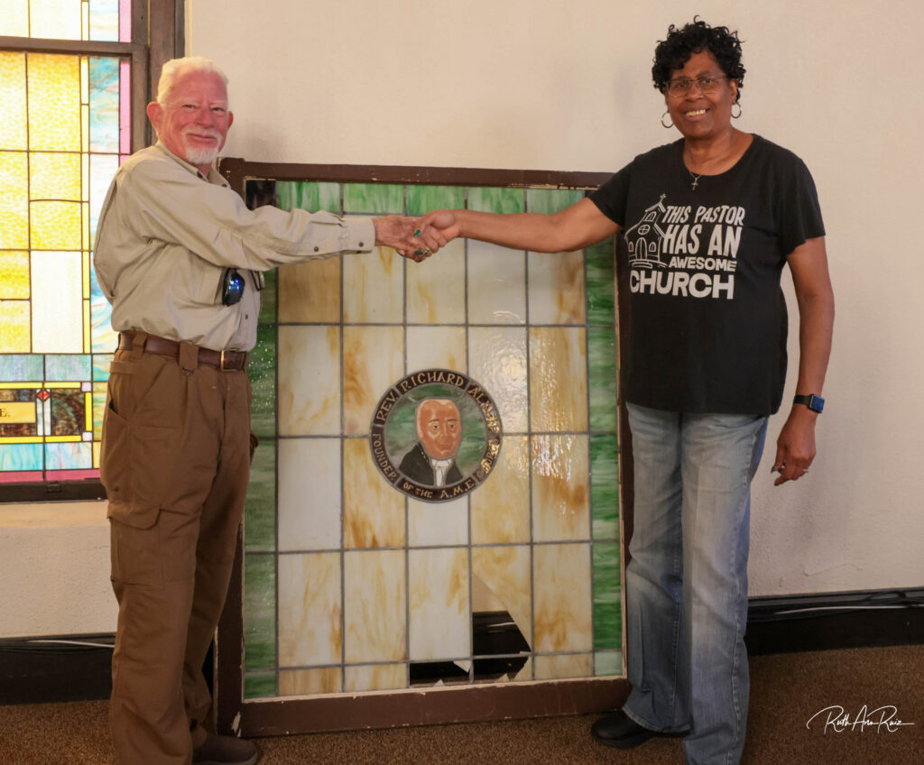Surprise and delight were expressed by everyone who gathered around the stained-glass window at Reedy Chapel on Saturday. Reverend Lernette Patterson was pleased to receive the window  from Hal Newsom, who had found it on the side of a road.