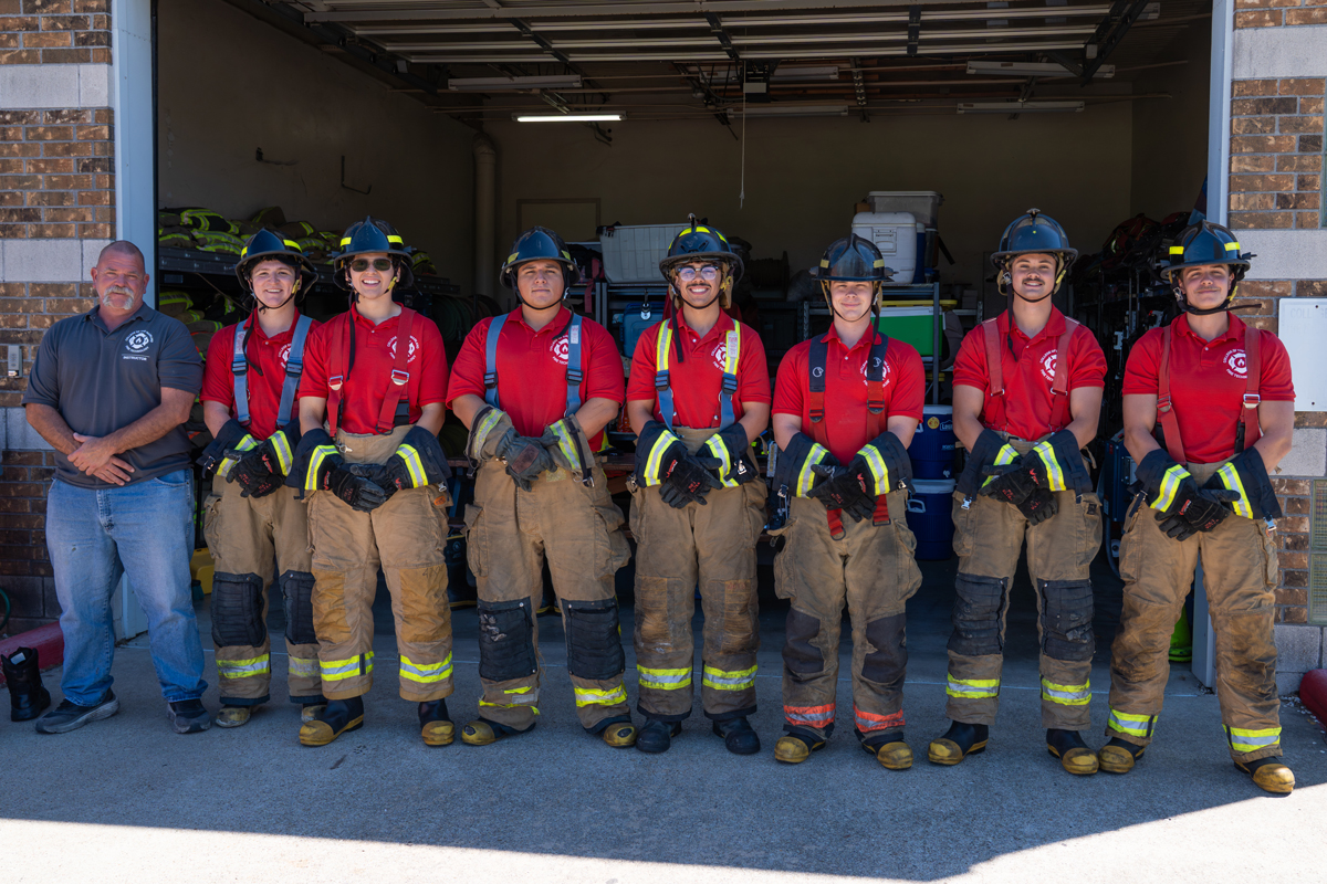 Photo: (Left to right) Dickinson Volunteer Fire Department Chief and COM Fire Academy Instructor Tim Johnson, COM Fire Academy Cadets Jordan Lowe, Efrain Perez, Ruben Sanchez, Dakota Lloyd, Ashtin Anderson, Isaiah Kam, Jackson Elliott.