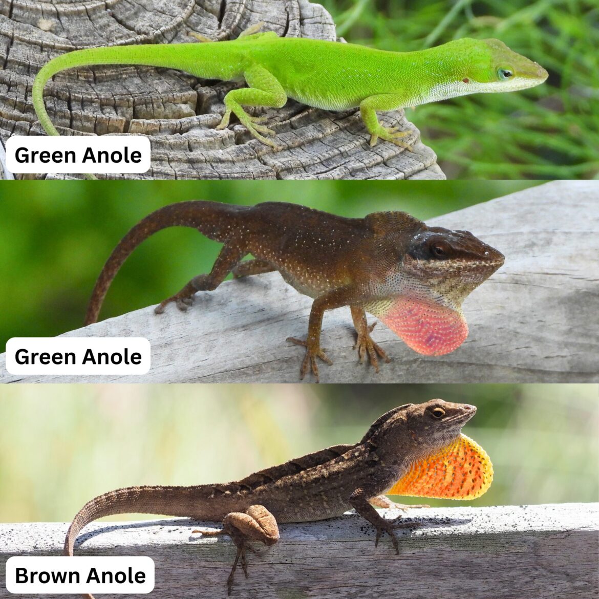 Photo caption: Top: A green Green Anole. Middle: A brown Green Anole. Bottom: A Brown Anole