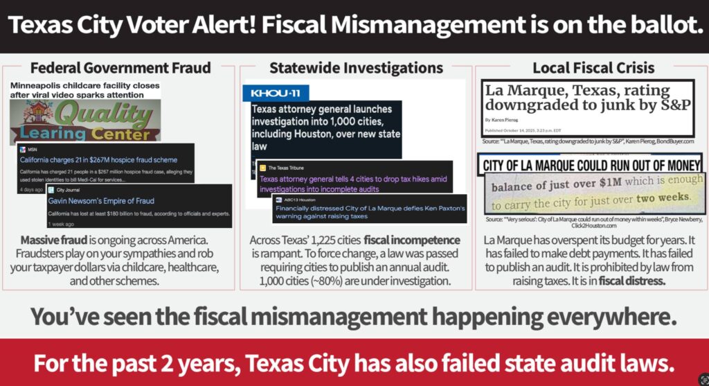 The Texas Attorney General has discovered that of the 1,225 cities across the State, 1,000 of them (80%) have filed to publish fiscal audits timely. Research it yourself; the fiscal mismanagement is everywhere across Texas.