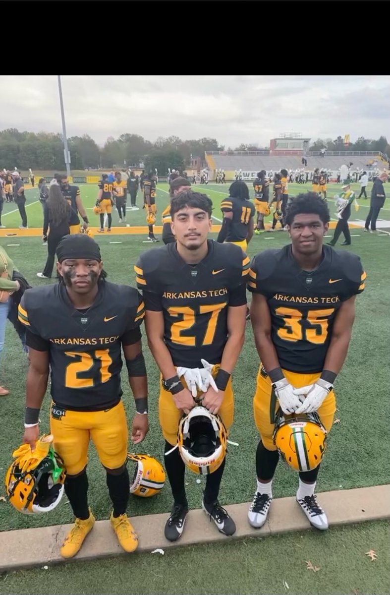 Dickinson football alums De’Rion Crooms (21), Diego Sanchez (27), and Tyree Woods (35) gathered for the camera after Arkansas Tech fell to East Central 23-13 on Saturday. The game was …